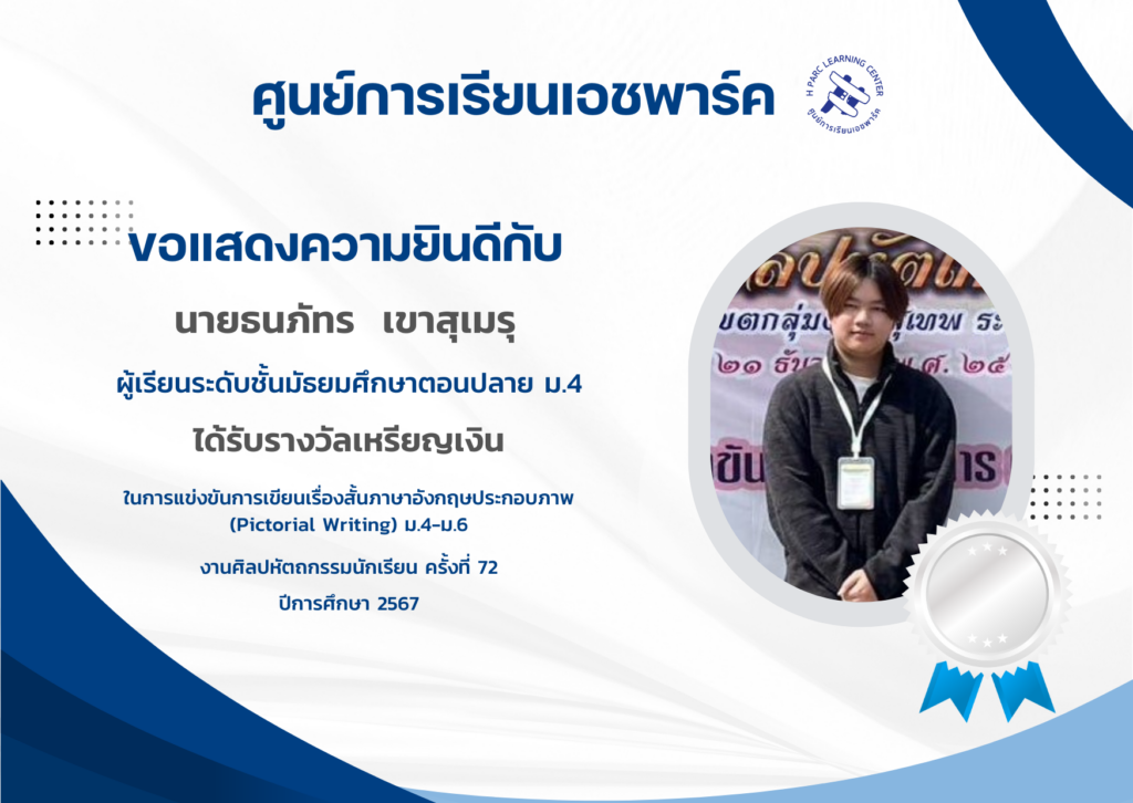 ขอแสดงความยินดีกับนายธนภัทร เขาสุเมรุ ผู้เรียนระดับชั้นมัธยมศึกษาตอนปลาย ม.4 ได้รับรางวัลเหรียญเงิน ในการแข่งขันการเขียนเรื่องสั้นภาษาอังกฤษประกอบภาพ (Pictorial Writing) ม.4-ม.6 งานศิลปหัตถกรรมนักเรียน ครั้งที่ 72 ปีการศึกษา 2567 ณ โรงเรียนวัฒโนทัยพายัพ จังหวัดเชียงใหม่