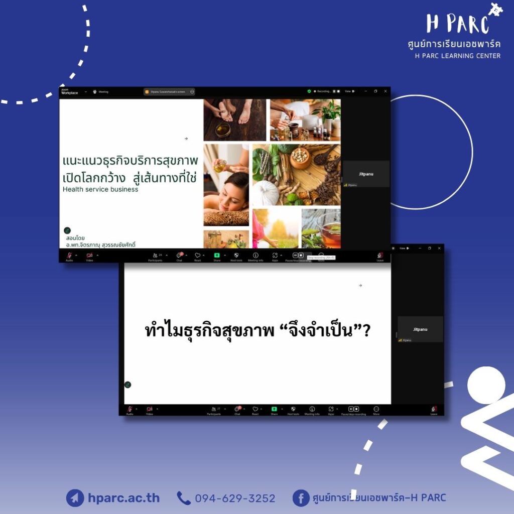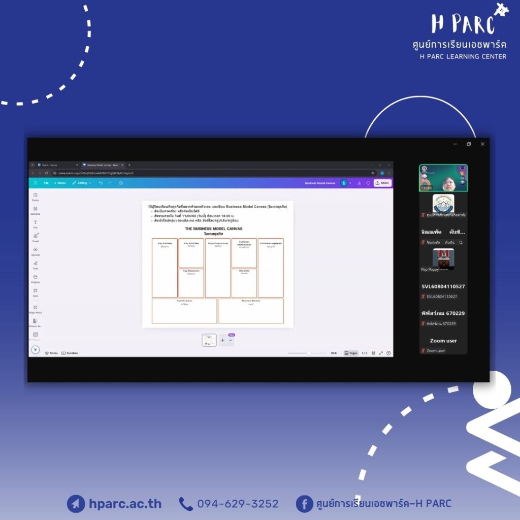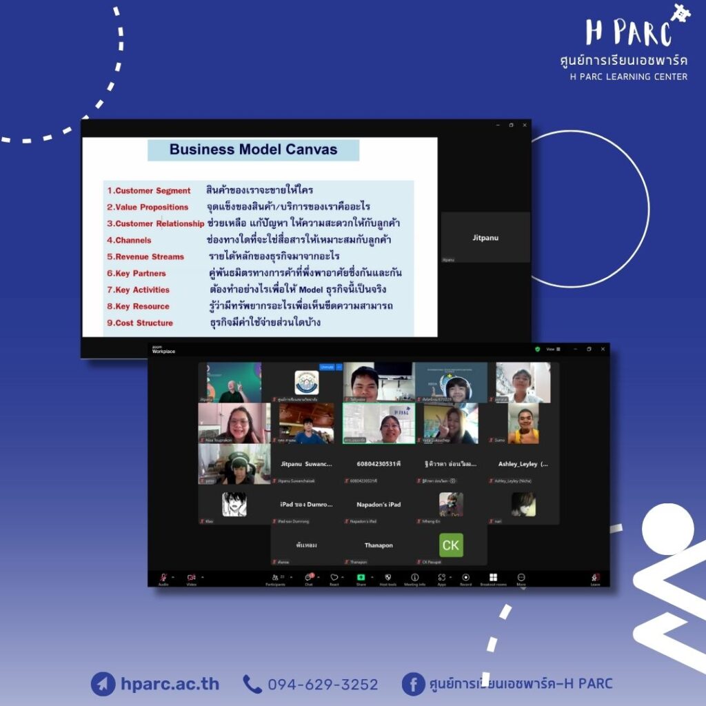 กิจกรรมการเรียนการสอนเสริมสำหรับผู้เรียนศูนย์การเรียนเอชพาร์ค พบครูที่ปรึกษาHParc Consult Project รายงานความคืบหน้า – อ.อ๋อมและอ.ปาล์ม, เรียนเสริม Work Skill /Online หัวข้อ ธุรกิจบริการสุขภาพ – อ.เค และ Apply Academic Skill หัวข้อ การเขียนแผนธุรกิจ (ฺBusiness model canvas) – อ.อ๋อมและอ.ปาล์ม เป็นผู้สอน ผ่านทางโปรแกรม Zoom