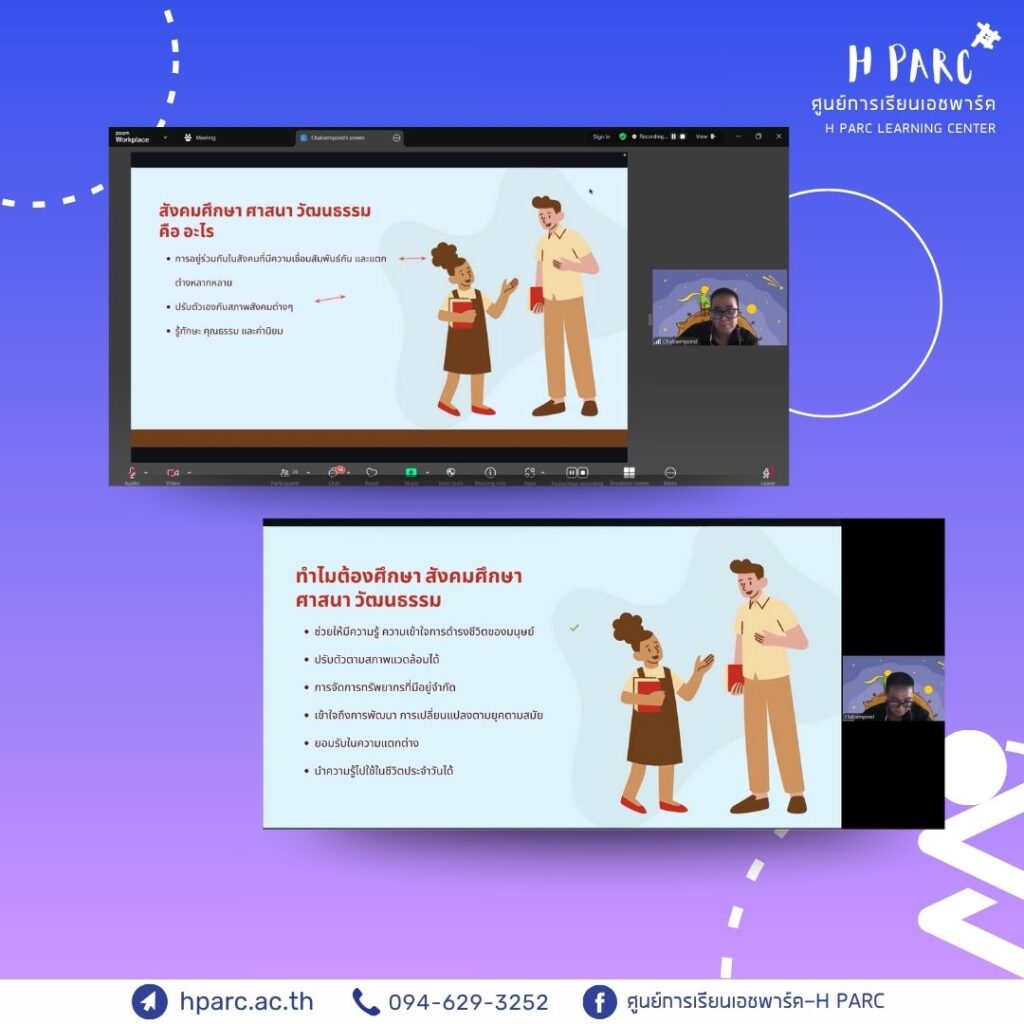 กิจกรรมการเรียนการสอนเสริมสำหรับผู้เรียนศูนย์การเรียนเอชพาร์ค บครูที่ปรึกษา HParcS รายงานความคืบหน้าแบบฝึก – อ.อ๋อม, เรียนเสริมวิชาการ ไทย – อ.นัท, เรียนเสริมวิชาการ English – อ.ก้อย และ เรียนเสริมวิชาการ สังคม – อ.ตั๊ม เป็นผู้สอน ผ่านทางโปรแกรม Zoom