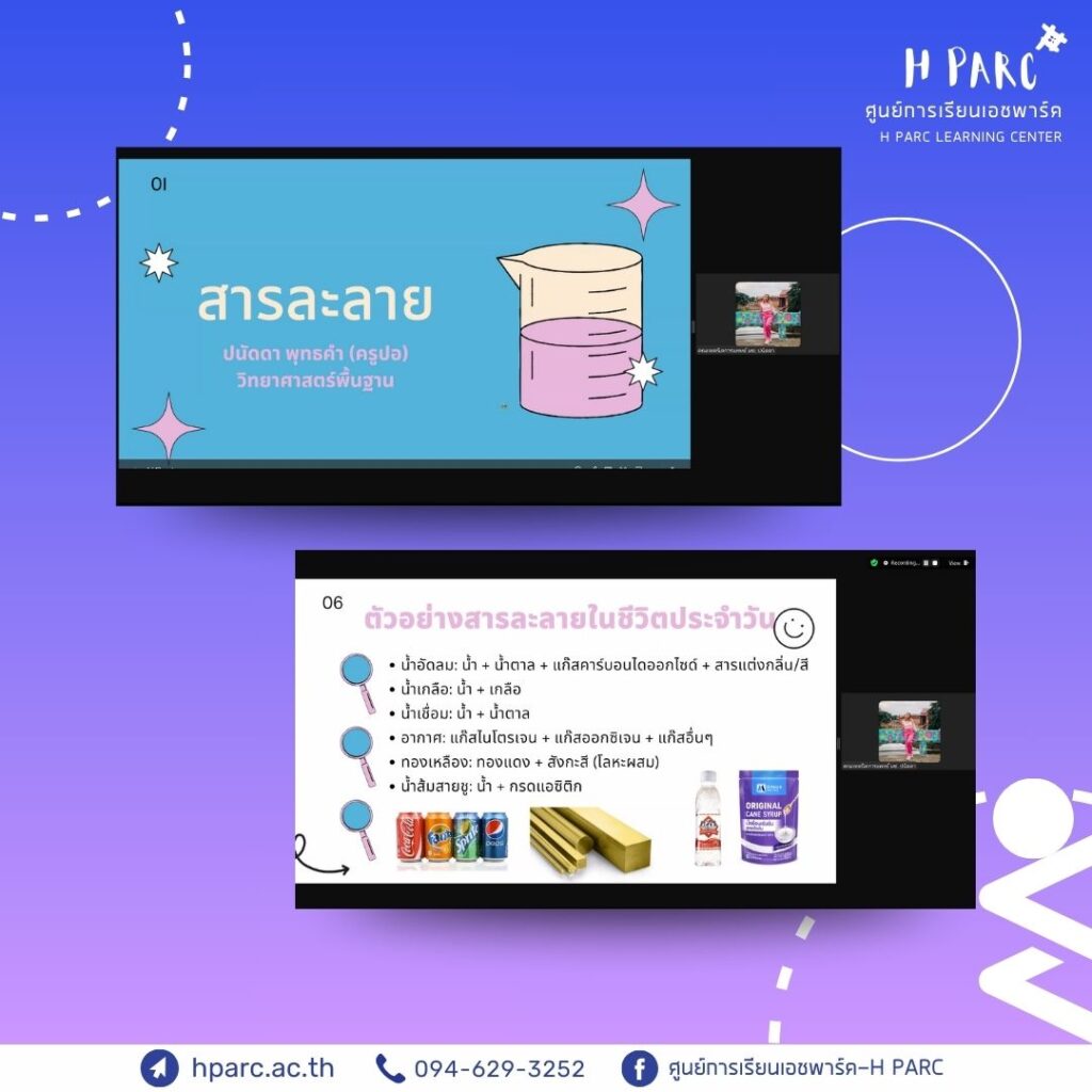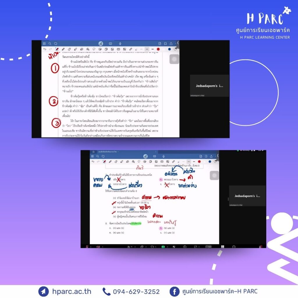 กิจกรรมการเรียนการสอนเสริมสำหรับผู้เรียนศูนย์การเรียนเอชพาร์ค พบครูที่ปรึกษา รายงานความคืบหน้าแบบฝึก – อ.อ๋อม, เรียนเสริมวิชาการ วิทย์ – อ.ปอ และ เรียนเสริมวิชาการ ไทย – อ.นัท เป็นผู้สอน ผ่านทางโปรแกรม Zoom