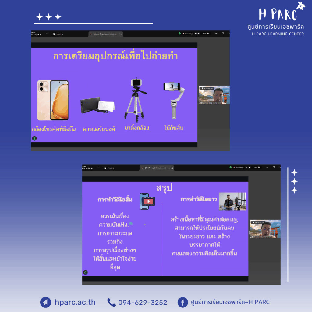 กิจกรรมการเรียนการสอนเสริมสำหรับผู้เรียนศูนย์การเรียนเอชพาร์ค เรียนเสริม Life&Future Skill App for Creative หัวข้อ การถ่ายทำคลิป รีวิวสถานที่ – อ.โฮป เป็นผู้สอน ผ่านทางโปรแกรม Zoom