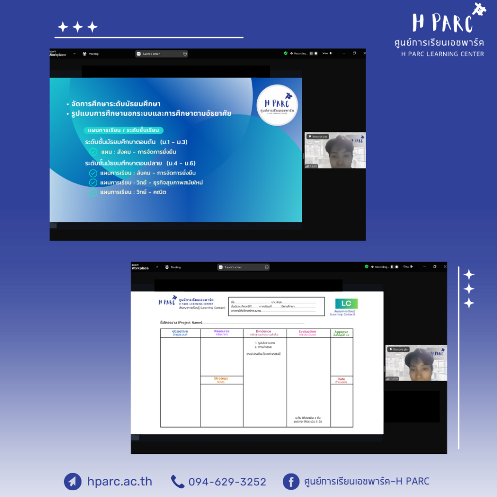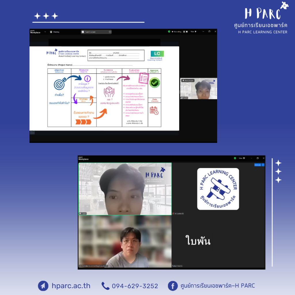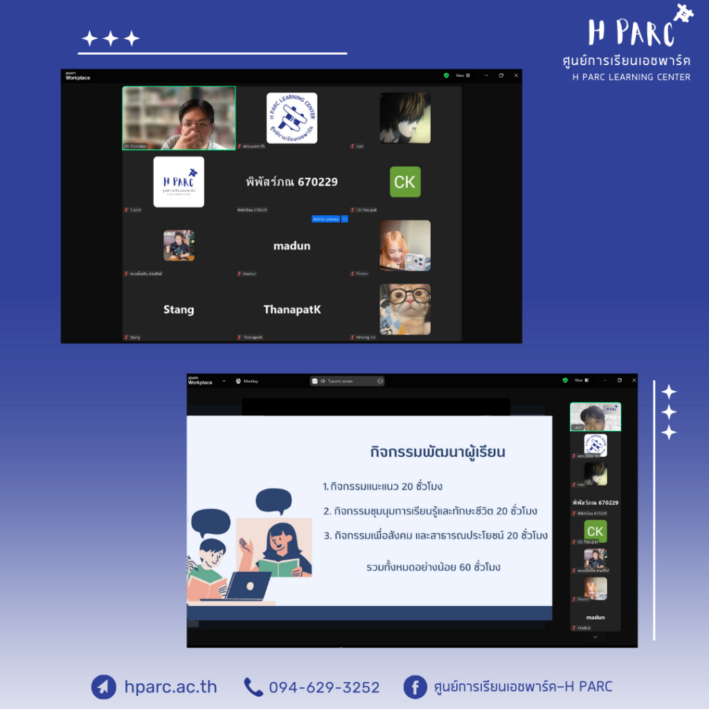 ศูนย์การเรียนเอชพาร์ค จัดกิจกรรมการปฐมนิเทศผู้เรียนใหม่ ภาคเรียนที่ 1 ปีการศึกษา 2568 – อ.อ๋อม และ อ.ปาล์ม และจัดกิจกรรมการเรียนการสอน พบครูที่ปรึกษาHParc Consult Project – อ.จิลล์ และ HParc-Learn Skill การใช้งานระบบ การทำแฟ้ม การบ้าน การส่งงาน การเรียนเสริมและการเตรียมความสอบก่อนเข้าสอบ – อ.อ๋อม เป็นผู้สอน ผ่านทางโปรแกรม Zoom