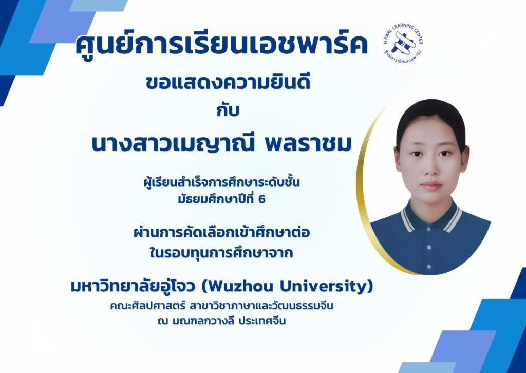 ศูนย์การเรียนเอชพาร์ค ขอแสดงความยินดีกับ นางสาวเมญาณี พลราชม ผู้สำเร็จการศึกษาชั้นมัธยมศึกษาชั้นปีที่ 6 ที่ผ่านการคัดเลือกเข้าศึกษาต่อในรอบทุนการศึกษาใน คณะศิลปศาสตร์ สาขาภาษาและวัฒนธรรมจีน ณ มหาวิทยาลัยอู่โจว มณฑลกวางสี ประเทศจีน ปี พ.ศ. 2568 – 2569