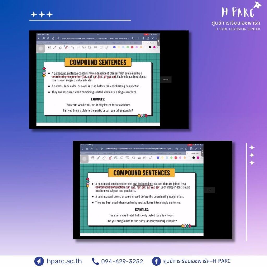 กิจกรรมการเรียนการสอนเสริมสำหรับผู้เรียนศูนย์การเรียนเอชพาร์ค พบครูที่ปรึกษา รายงานความคืบหน้าแบบฝึก – อ.อ๋อม, อ.ปาล์ม และอ.ปาล์มมี่ และ เรียนเสริมวิชาการ ได้แก่ วิชาคณิตศาสตร์ – อ.ข้าว, วิชาภาษาไทย – อ.นัท และวิชาภาษาอังกฤษ – อ.ก้อย เป็นผู้สอน