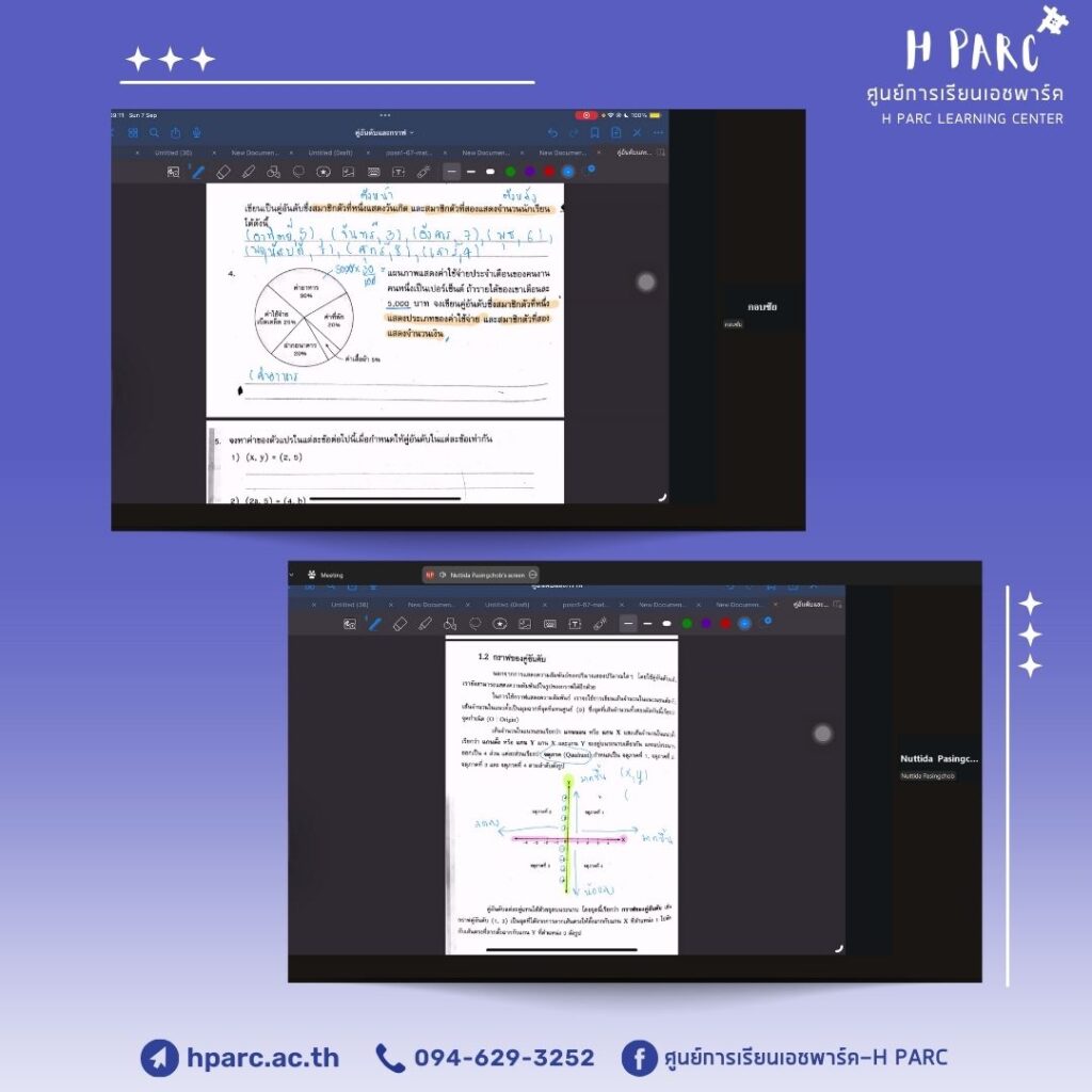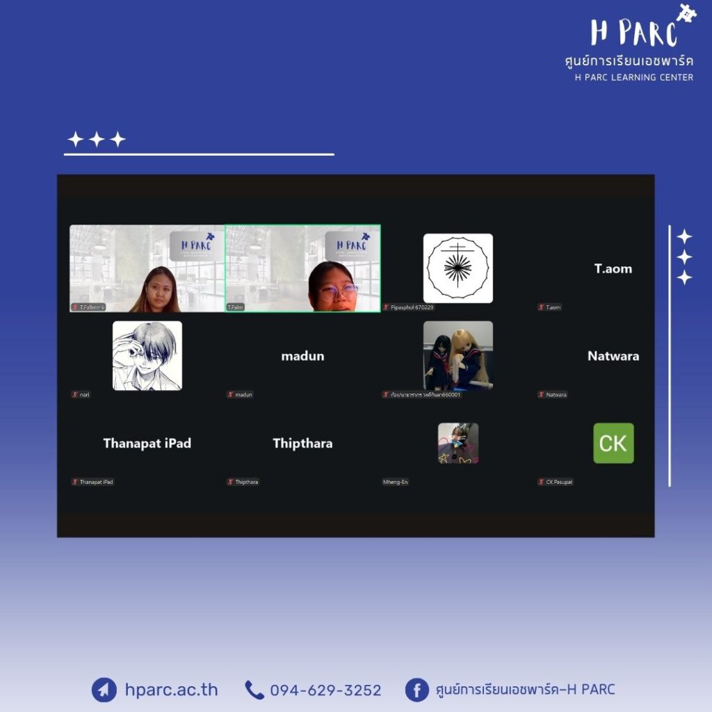 กิจกรรมการเรียนการสอนเสริมสำหรับผู้เรียนศูนย์การเรียนเอชพาร์ค พบครูที่ปรึกษา รายงานความคืบหน้าสมุดฝึก – อ.อ๋อม,อ.ปาล์มและอ.ปาล์มมี่, เรียนเสริมวิชาการ วิชาภาษาอังกฤษ – อ.ก้อย, เรียนเสริมวิชาการ วิชาสังคม – อ.ตั๊ม และ เรียนเสริมวิชาการ วิชาวิทยาศาสตร์ – อ.ปอ เป็นผู้สอน ผ่านทางโปรแกรม Zoom เป็นผู้สอน
