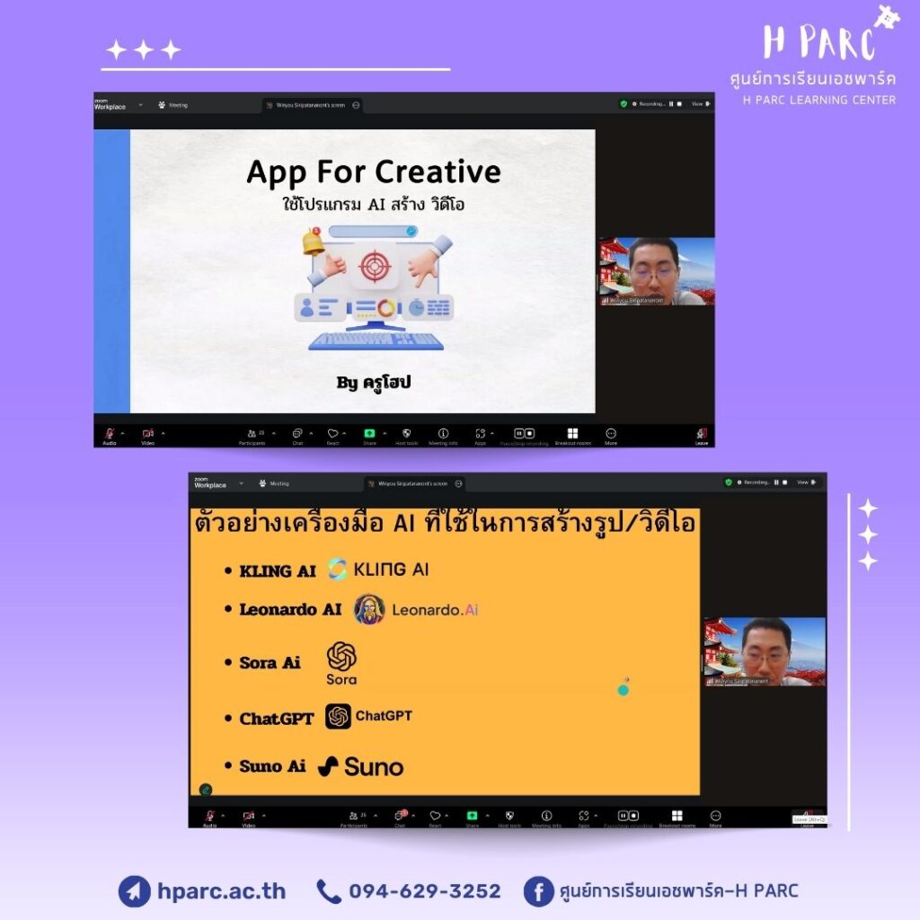 กิจกรรมการเรียนการสอนเสริมสำหรับผู้เรียนศูนย์การเรียนเอชพาร์ค เรียนเสริม Life&Future Skill App for Creative หัวข้อ ใช้โปรแกรม AI สร้างวิดิโอ – อ.โฮป เป็นผู้สอน