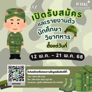 ศูนย์การเรียนเอชพาร์คประชาสัมพันธ์การเปิดรับสมัครและรายงานตัวนักศึกษาวิชาทหาร (รด.) รับสมัครและแจ้งรายงานตัวนักศึกษาวิชาทหารปีการศึกษา 2568 กำหนดการแจ้งประสงค์รับสมัครและรายงานตัว(พร้อมจัดส่งเอกสาร) ตั้งแต่วันที่ 12 พฤษภาคม – 21 พฤษภาคม 2568 เอกสารที่ใช้ในการสมัคร 1. รูปถ่ายขนาด 3 x 4 ซม. ที่ถ่ายไม่เกิน 6 เดือน จำนวน 4 รูป