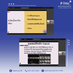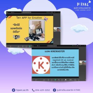 กิจกรรมการเรียนการสอนเสริมสำหรับผู้เรียนศูนย์การเรียนเอชพาร์ค พบครูที่ปรึกษาHParc Consult Project รายงานความคืบหน้า – อ.จิลล์ และ เรียนเสริม Life&Future Skill App for Creative หัวข้อ การตัดต่อวิดิโอ/ทำคลิปเบื้องต้น VDO Edit 101 – อ.โฮป เป็นผู้สอน ผ่านทางโปรแกรม Zoom